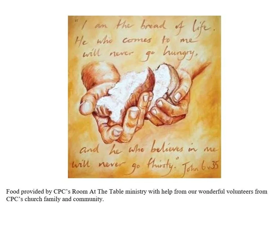 CPC is inviting those in need of a meal to our table. We will be serving a to-go prepackaged meal to the first 80 individuals every Tuesday from 4:30 p.m. to 5 p.m.